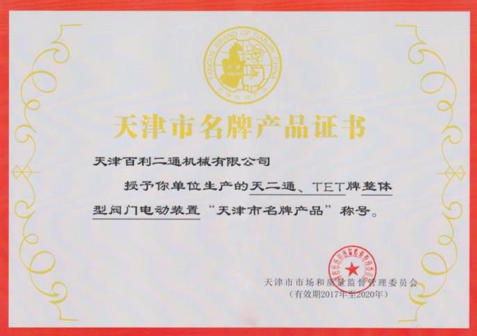 整體型閥門電動裝置名牌產(chǎn)品證書
