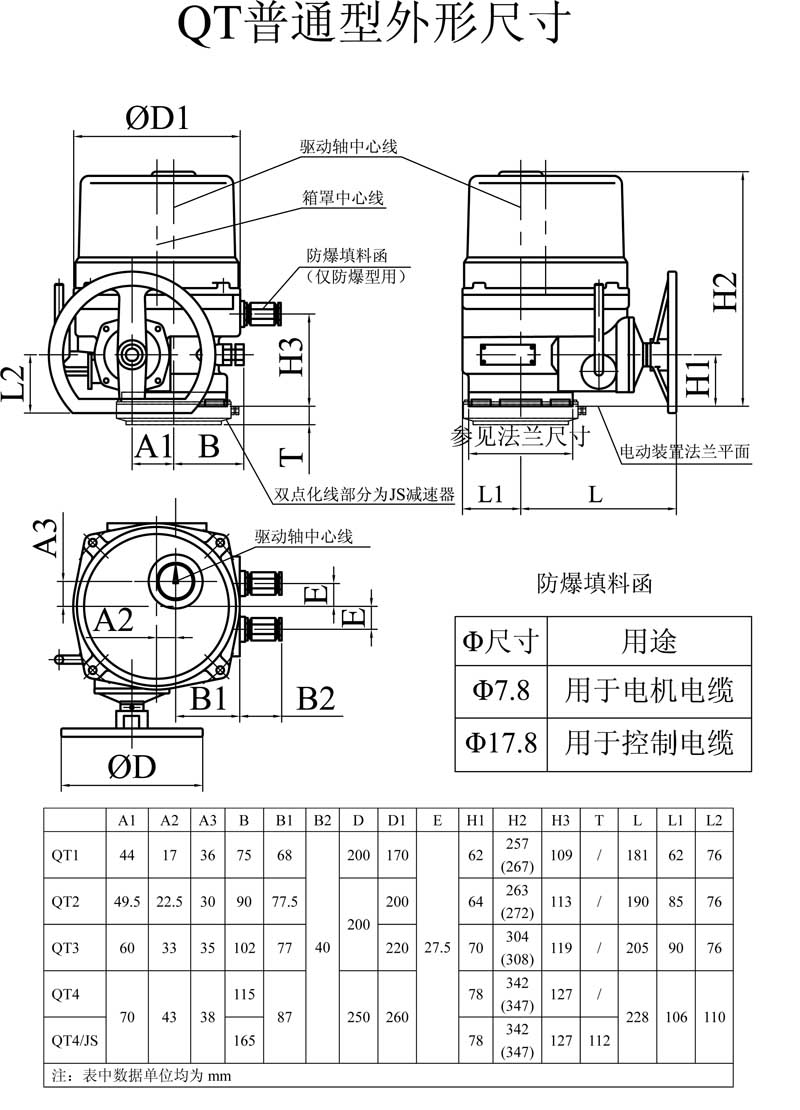 QT1~QT4型部分回轉(zhuǎn)閥門電動(dòng)裝置是我公司最新研制的換代型產(chǎn)品。適用于控制蝶閥、球閥、旋塞閥等做90°回轉(zhuǎn)的閥門。該產(chǎn)品替代同規(guī)格的QB系列產(chǎn)品,體積小、重量輕、具有高效率、高可靠性、高防護(hù)性能、低噪音等特點(diǎn)。可現(xiàn)場(chǎng)操作,也可遠(yuǎn)距離控制。可廣泛用于石油、化工、發(fā)電廠、水處理、造紙等各行業(yè)。該產(chǎn)品的防護(hù)等級(jí)為IP67,隔爆型產(chǎn)品(型號(hào)中有Ex)的隔爆等級(jí)為dⅡBT4。